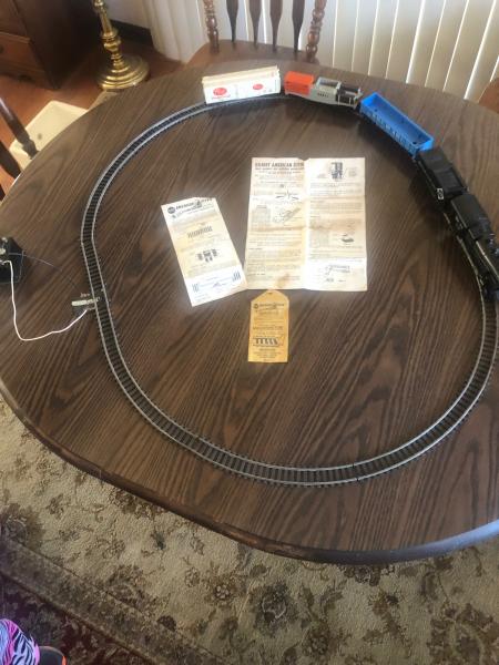 Has Transformer 10 pieces of track Engine 21165 Coal Tender car Post Breakfast Cereal car Boston and Maine car American Flyer tie car very good shape also still has the instructions with it.