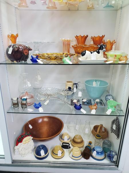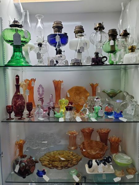 More antique glass, stoneware, lamps, graniteware, paperweights, oil lamp chimneys, etc. in the showcase, see pictures below.