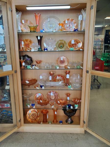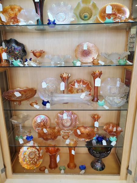 A showcase of Quality Antique Carnival Glass, at McKenzie Antique Mall, McKenzie, Tennessee.
