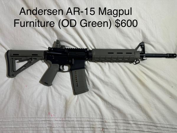 Up for sale is a good used Andersen AR-15 223/556 with Magpul OD Green furniture. Gun is in great shape. Call or text 2seven0-2nine3-8two8five with any questions