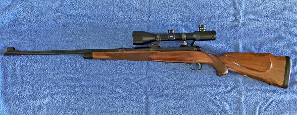 The rifle is fitted with high-end German-made Zeiss Varipoint V 2.5-10x50 scope with Number 60 reticle, a dot with three thin lines, in low -mount Recknagel detachable scope rings, perfectly matched for com height. The scope is a $2800.00 plus with another $450.00 for the Recknagel rings. Also included are Butler Creek flip up scope covers.