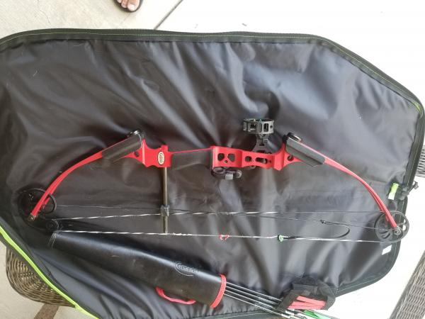 Mini Genesis bow with Peep sight and biscuit. Comes with a case and arrows. Works well, no trades!