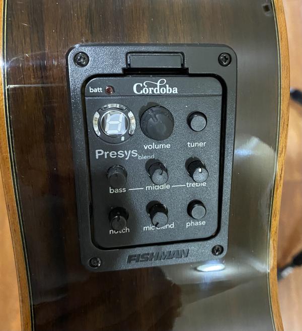 Cordoba Fusion 12 nylon electric guitar with padded gig bag. Specifications: top Canadian cedar top, mahogany sides and back. Mahogany neck with a thinner profile than most nylon guitars. Smaller nut 1.875” with ebony finger board. Built in Fishman Presys pickup system.