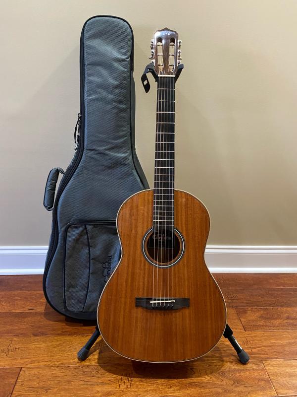 Cordoba L9-E Spanish inspired steel string parlor guitar. Solid mahogany top, back, and sides. 00 body size. 12 frets to body, a 1-3/4” nut width and 24.2” scale. Ebony finger board. Grover tuning machines. Fishman Sonitone pickup system. Comes with padded gig bag.