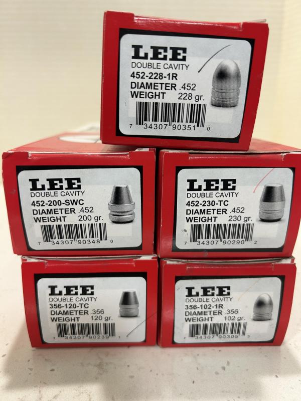 Here are three different 44Mag and two 9MM bullet style and weight.. These molds have been used very little and are in great shape. See the specs on the end of the boxes..