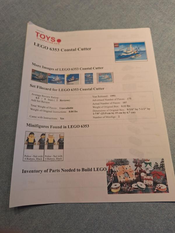 LEGO 6353 Coastal Cutter. 1991 - Retired. 187 Pieces. Complete set. Instruction book and List of pieces. Asking $35 or Best Offer. Cash Only.