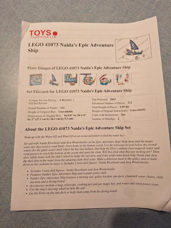LEGO 411073 Naida's Epic Adventure Ship. Made in 2015. 312 Pieces. Complete set with Mini Figures. List of Pieces and Instruction book. Asking $25.00 or Best Offer. Cash Only.