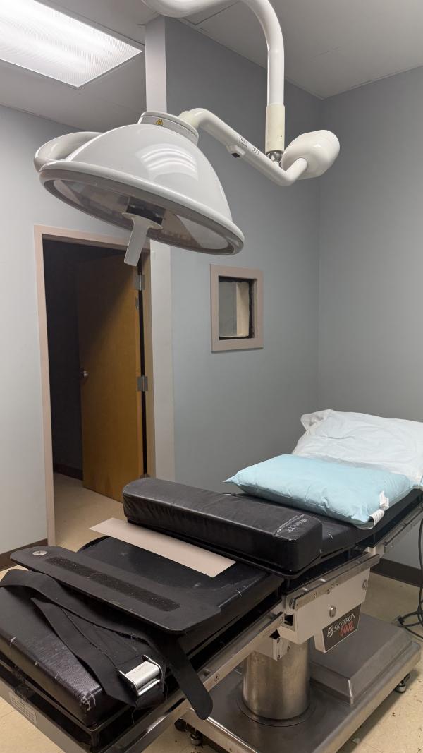 X-Ray Room with Lead Lined Walls, Adjustable Exam Table, Overhead Light and separate room for controls.