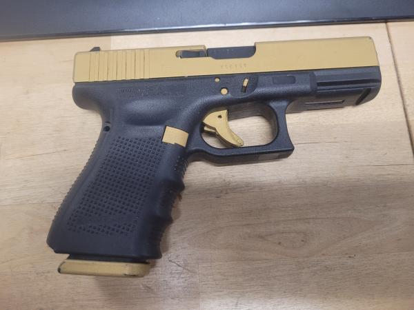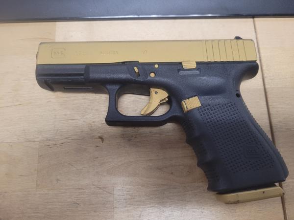 Glock 23 Gen 4, 40 cal. pistol, with one magazine, frame is black and other parts have been cerakoted gold (slide, trigger, bottome of magazine, magazine release, etc)