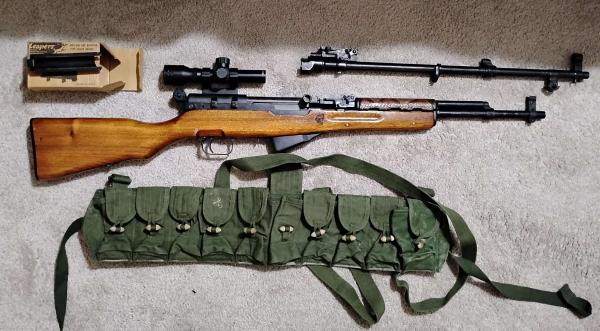 Scope is a 2.5x20, it has modified Tech sights, cut down barrel to 16.5" with a bulletbutton front sight, norinco spiker stock, custom snakeskin upper handguard, extra untouched barrel if you have skills or know a gunsmith to revert it to 20" with bayonet, original dust cover and leaperUTG scope mount, and a Chinese surplus chest rig, i also have some clips