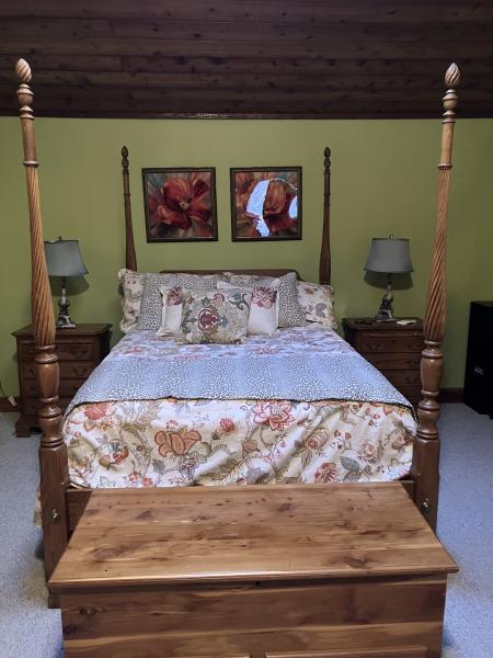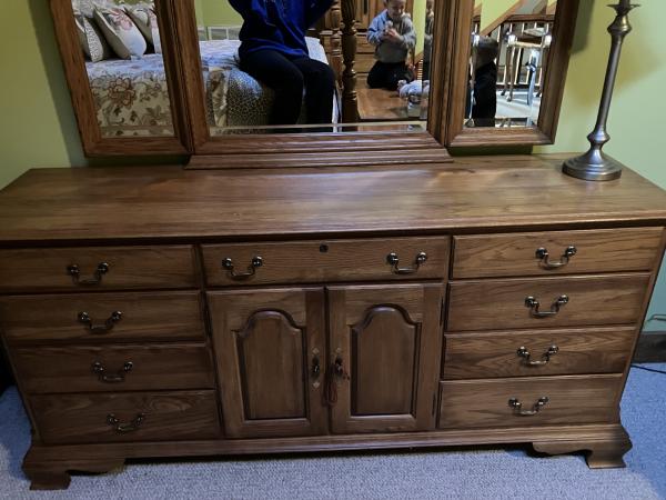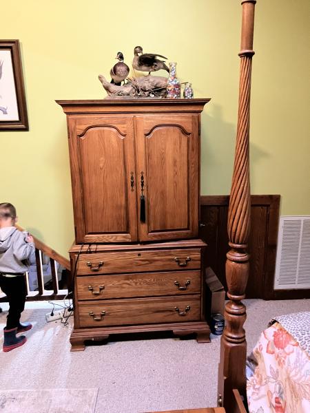 Queen Solid Oak 4 Poster Bed, 2 side tables, dresser with mirror and Armoire'- this furniture is in prestine condition- only selling because parent passed away and do not need a queen bed