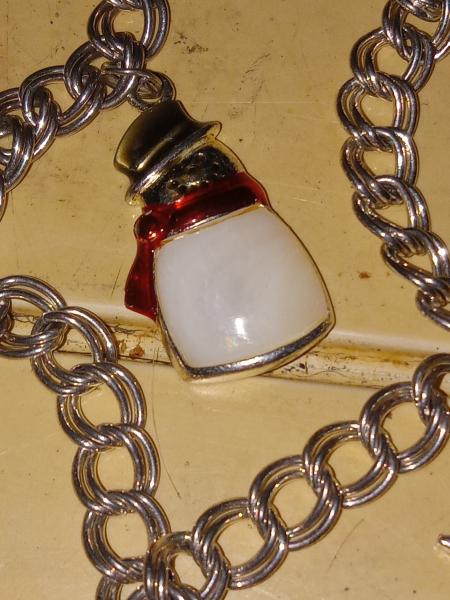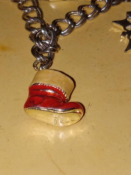 This is a vintage piece. Made of 925 sterling. Santa is 925 and mother of pearl with enamel paint. Boot is 925 with enamel paint. Both snow flakes are 925 also.One with stones. The bracelet is 925 sterling double link lobster claw lock 7inch long. $125.00 or best offer. 270-243-3026 thank you.