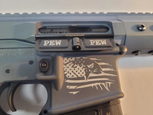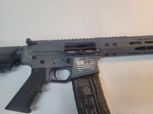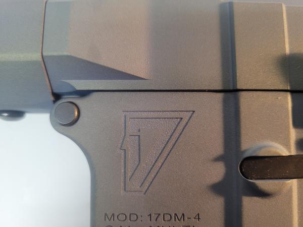 17 Design 17DM-4 5.56mm rifle with one magazine. Rifle color is a greensih gray, has Pew Pew on one side of the ejector and a flag on the other side, has a flag on the receiver, and has a flag on the magazine