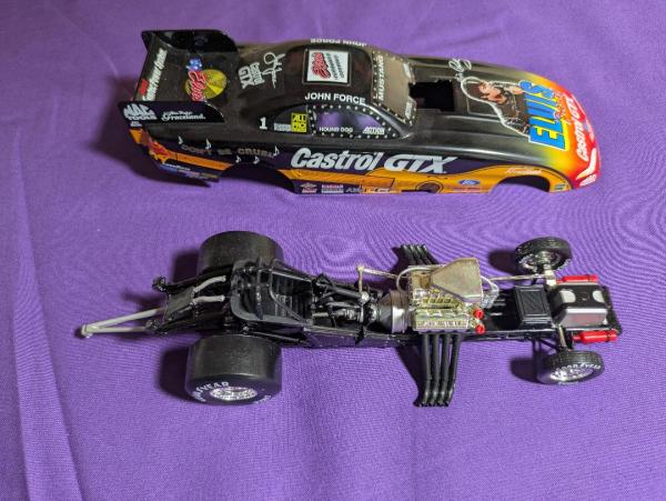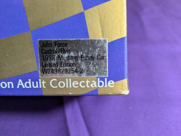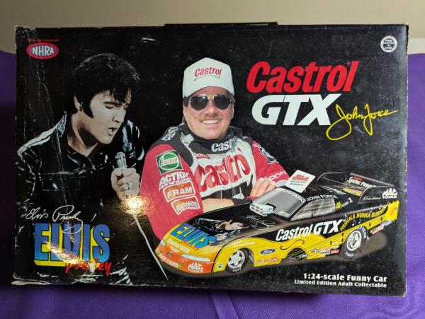 1999 Elvis John Force Die Cast Car SKU: W249829554-2. Is an official NHRA product, body lifts to show detailed interior, posable front tires, detailed graphics on body and chassis, detailed engine, limited addition, new in box, (box does have a tear on corner) platinum series. Have more cars too. $35.00