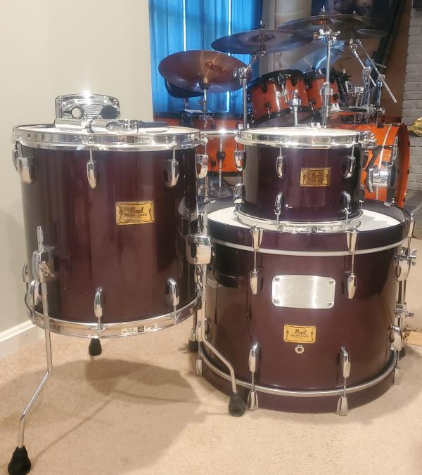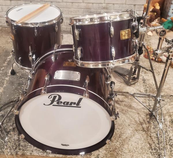 These beautiful purple Pearl Masters drums are the 4mm shells with Pearl's stainless steel 2mm Super Hoops. They were only made in 1992. Nice Evans heads and a stand and suspension mount for the 12 inch Tom are included. 20 inch kick drum. 12 and 14 inch Tom's. $700.00 cash. Offers considered. No trades. Thanks for looking and have a great day!