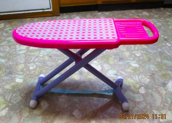Cute realistic toy ironing board and iron. Both made of durable plastic. The ironing board is stable when it stands and easily folds for storage. There is a space at the end to hang doll clothes after they’ve been neatly pressed.