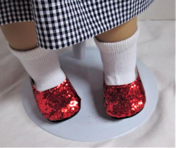 The dress is machine washable in cold water and dryable on low heat. The anklets should be handwashed and air-dried. The shoes can’t be washed but can be lightly “dusted” with a brush, like a soft toothbrush. Toto and his basket can be wiped down with a damp cloth or paper towel.