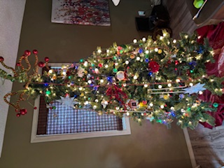 This tree is around 6 feet tall and does not include decorations on the tree except for some small white lights that came on the tree. The decorations in the other pic are included. Nice tree and easy fold out setup.