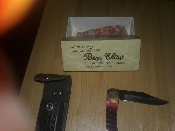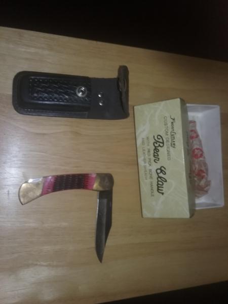 FROST CUTLERY CUSTOM DESIGNED BEAR CLAW FOLDING KNIFE WITH RED PICK BONE HANDLE WITH LEATHER SHEATH. NEW IN BOX NEVER USED.