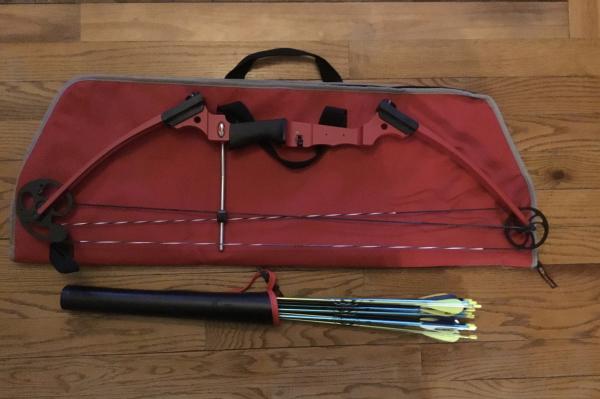 Genesis bow with case and 10 arrows. This is the bow used in schools. Grandson has switched to fishing.