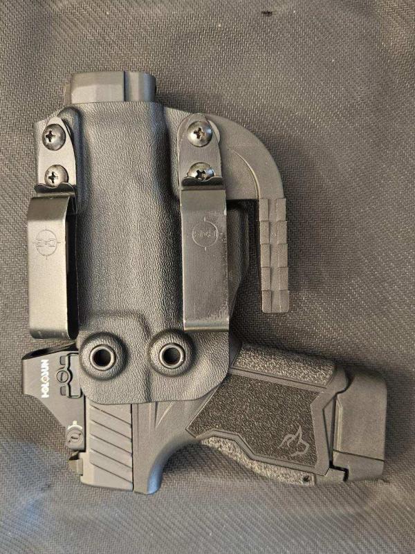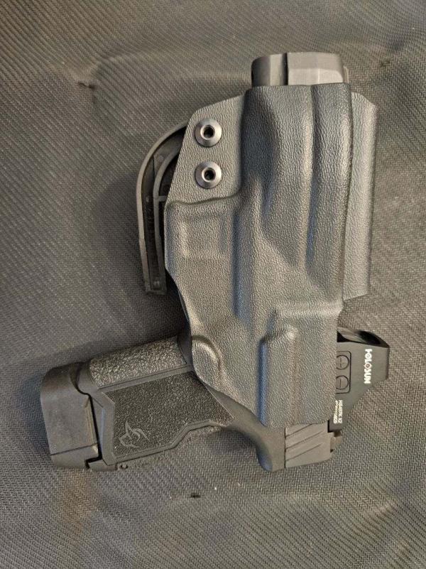 Holosun red dot, 6moa. Holster is iwb. Less than 500 rounds down range.
