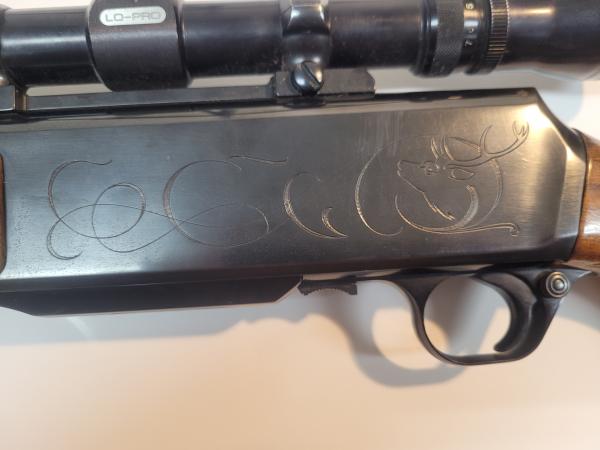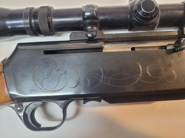 1967 Browning Bar Grade II rifle, 30-06, Redfield scope, has some scratches on the stock (on the sides and top) and has some marks on the top of the barrel, has an elk head on one side of the receiver and an antelope head on the other side, made in Belgium