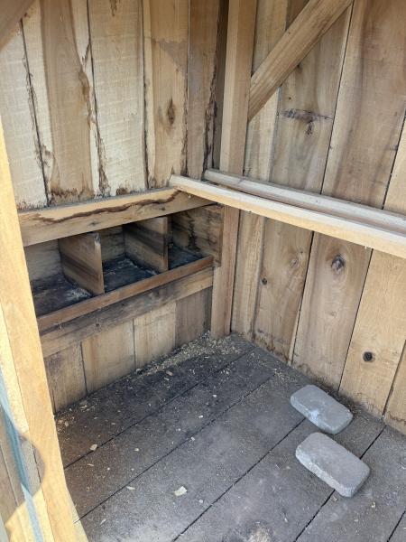 Nesting box for three chickens, outside hatch access lid, perching bars, two walk in doors.