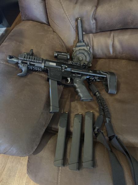 Maxim brace, 4 30rd Glock magazines. 1 100 round drum, holosun red dot scope. 1400 obo 270-293-2206