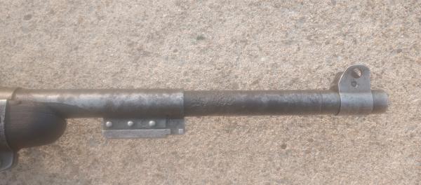 The overall metal finish is not great. There is some pitting on the receiver and metal parts below the woodline, a little bit around the receiver ring, and some on the barrel just in front of the bayonet lug. There is very little parkerizing left, but there is no rust and everything is very solid. The slide and bolt are in very good condition. The bore and muzzle are in great condition. I've included a picture of the worst pitting on the barrel.
