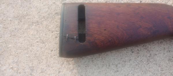 The stock has some dents and dings and minor scratches. There is one crack that was repaired with a couple of staples on the right side of the toe (shown in picture). The butt plate on the stock appears to be in new condition, so it's most likely a commercial replacement.