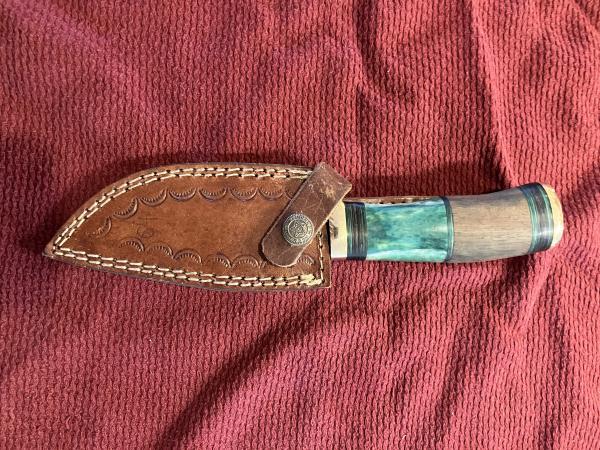 Damascus forged fixed blade knife. The buckle on the sheath says “Great seal of the state of Oklahoma”.