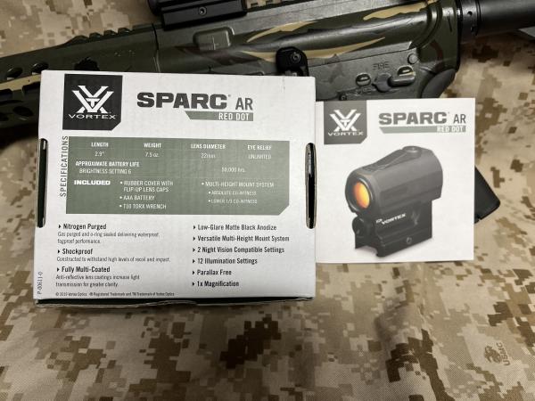 Vortex Sparc red dot with the box and all factory items. It is powered by an AAA battery. All Vortex products have a time warranty. $60