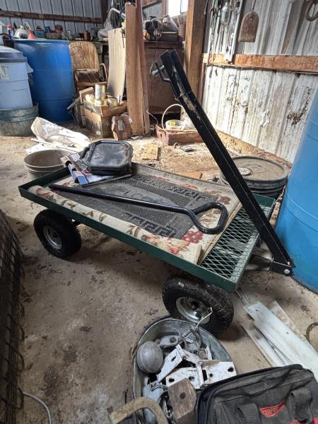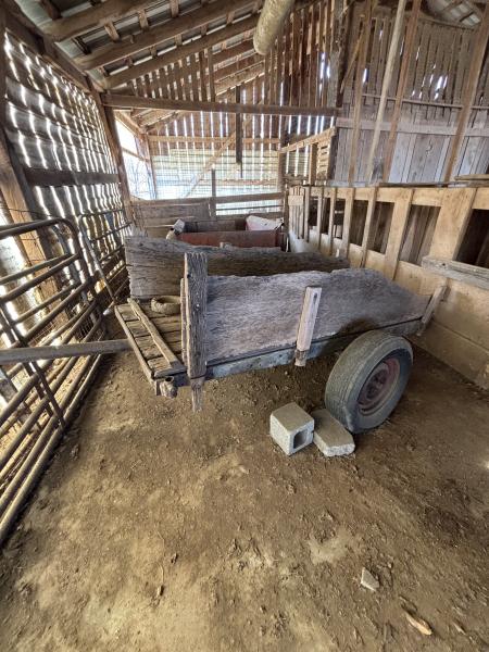 Trailers/Wagons: 4’x8’ flatbed steel trailer w/good tires, truck-bed utility trailer, small pull-behind wagons (2), vintage 12’ pull-behind manure spreader