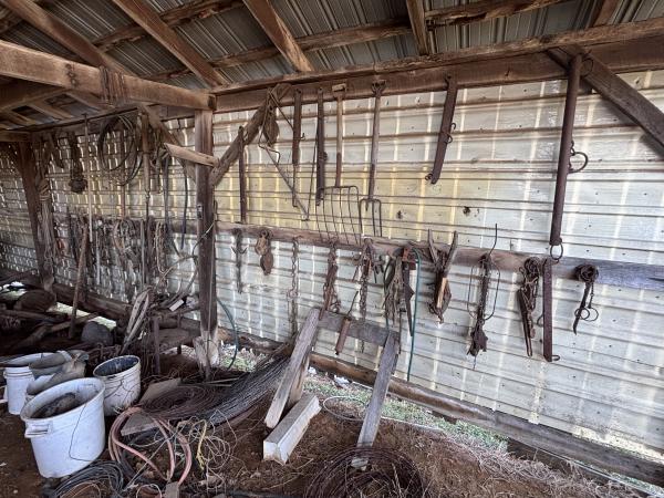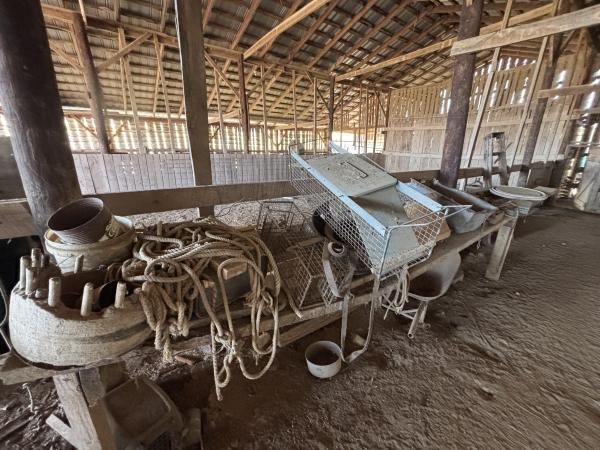 Miscellaneous: assortment of horse tack, load binders, pitch fork, Pet Porter dog crates (2), small pet taxi, wooden saw horses (4), assorted chains, tractor draw bar, multiple partial rolls of barbed wire, +/-20 t-posts, assorted live animal traps, rolled fencing, 55-gallon drum barrels, miscellaneous trash cans (3), steel cattle head catch, old porch swing, several fish nets, 16’ hog panel (1), nylon rope, log tongs, plastic lifeguard safety barrel, misc. gas cans/funnels, car ramps, vintage Universal hand-crank meat grinder, +/-10” Ford hubcaps (4)