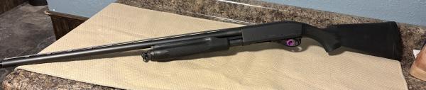2 3/4 or 3 inch 12 gauge with extended turkey choke. Does have a small hole in the bottom of the pistol grip where someone put a sling stud.