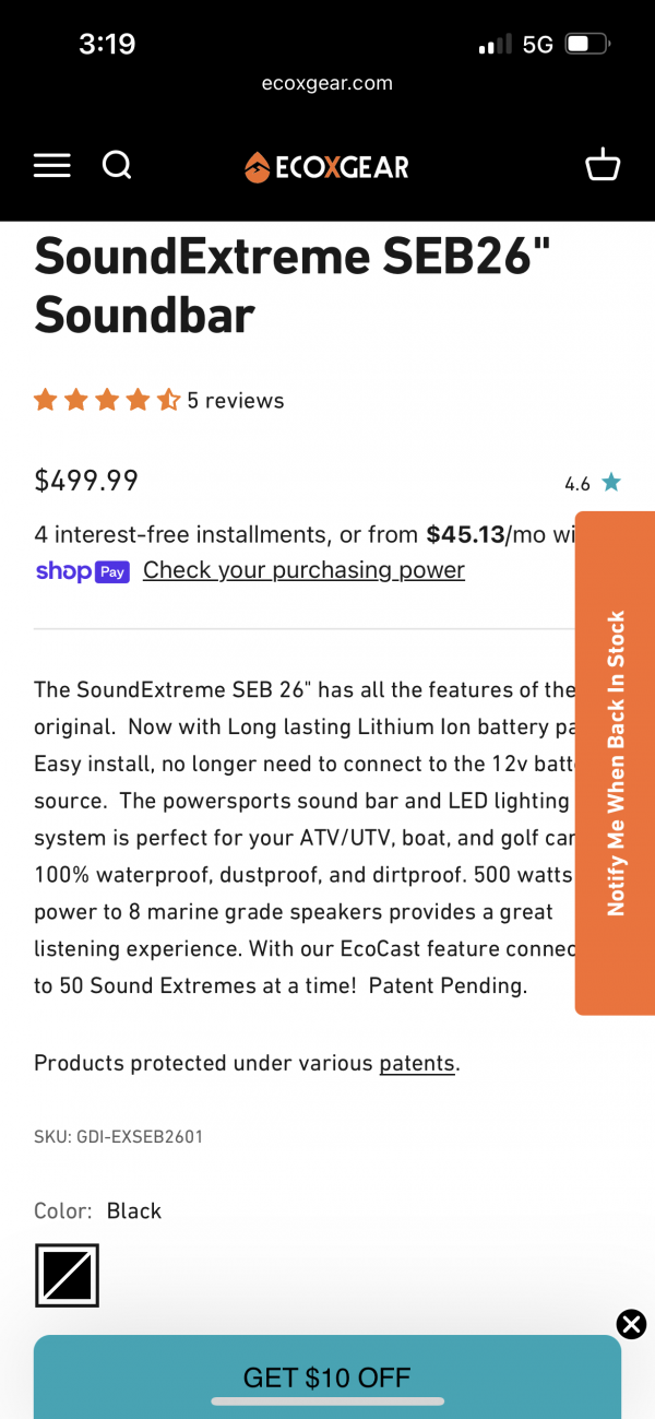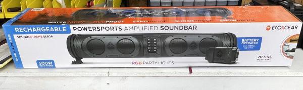 For sale is a brand new Ecoxgear battery powered 500W sound bar. This is a premium quality 8 speaker system, perfect for boats, golf carts, RV, camper, atv use.