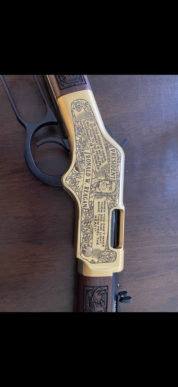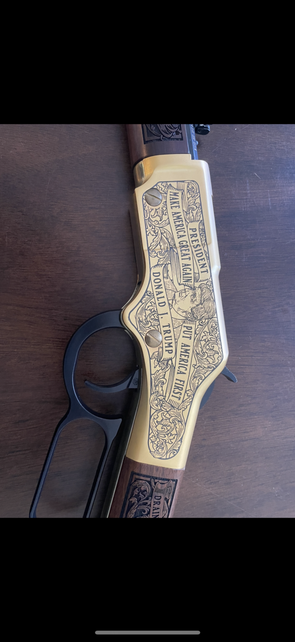 $1700 OBO! Henry Pass the Torch rifle, with President Trump on one side and President Reagan on the other. Beautifully engraved and never been fired. No Box. Great conversation piece! Numbered 9 out of 10. Text 270-559-8560 for more pictures. Thanks!