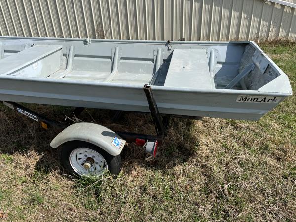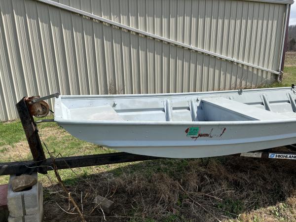 Very nice older Jon boat. 14’ long and 34” wide at bottom. Not beat up at all. Good trailer and tires. No motor. Text or call 2709692703.