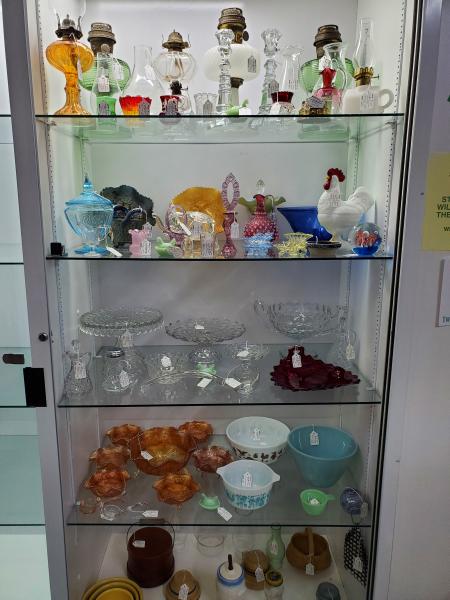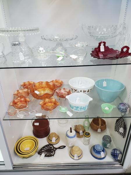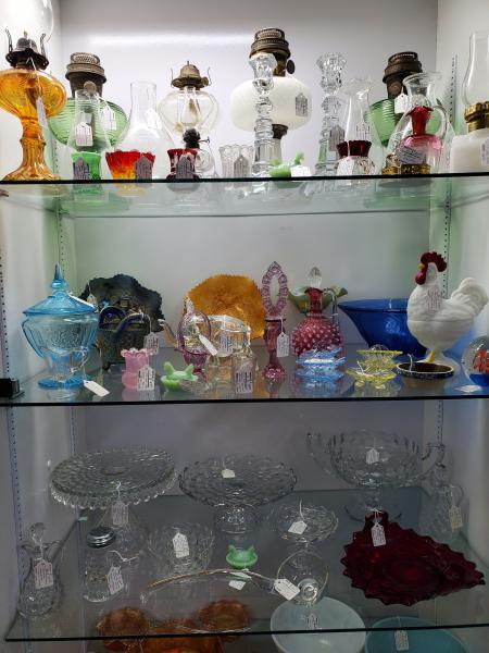 | All items inside TWIN LAKES ANTIQUE MALL in Gilbertsville, KY. Many, many things that you just don`t see these days anywhere. In Showcase "U" You can call 270-362-2218 if you want to see if something is still available. JUST TOOK IN 10/26/2025 Jadeite Hen on Nest Salts $15.50 each Pair of tall Clear glass Candlesticks, very pretty $15pr Fostoria American pattern: Cake Stand, this is the shorter stem cake stand, hardest one to find $49 Large, stemmed, 2 handle Trophy Bowl $45 Crab meat bowl with insert $18 Cruet with original stopper $18.50 Tall, Round Cake Stand, early 1 pc cake stand, super nice $79. Cheese or Sugar Shaker, looks like it was never used $29 Cheese Stand $15 Clear glass, Punch Bowl Ladle, has pouring spout on 2 sides, $22.50 Jadeite 1/2 Cup Measure $18. Fire King, Delphite blue color, Large Mixing Bowl, $49. EAPG Toothpick holder $8 Early Cast Iron Trivit $6 Milk Glass, Log Cabin, finger lamp, looks like it has never been used, Scarce lamp $55. Westmoreland, Milk Glass, Tall Standing Rooster candy dish, $59. Blue, Mayfair or Open Rose pattern, Depression Glass, Candy Dish with top, this is a fantastic item, $129., compare at Replacements LTD. website, their price is $359.99 Clear, Standing elephant with lift off top, nice $27.50 Pyrex Americana Bowl - large size $28 Blue glass, Vermont pattern toothpick holder $12 White Moonstone, Aladdin, Diamond Quilt pattern Lamp with nice burner, this is a super condition lamp, doesn`t appear to have been used much, if any $225 Oil lamp chimneys, #1 size, #2 size, all old ones, plain ones, decorated ones, beaded tops, ruffled tops, etc. Bohemian ruby cut to clear toothpick holder $19 EAPG Green/Opal Diamond Spearhead toothpick holder $19 Murano Smokey pink color toothpick holder, has Murano label on bottom $19 Pink Mayfair or Open Rose, Shot Glass, this is an old one, Extremely RARE $49 Donald Duck clear glass Mustard Bank with ORIGINAL Lid, lids are impossible to find $22.50 Antique Carnival Glass, Northwood, Marigold color, GOOD LUCK ruffled Bowl, Super Pretty $45 Cranberry Opalescent Hobnail Cruet, with stopper, $25 Cambridge Caprice, Moonlight Blue color ftd salt or nut dishes, 4 - $15 all Cambridge Caprice, Yellow ftd. salt or nut dishes, 3 - $9 all Aladdin lamp Model B, gallery for burner, super nice, old one $20 Blue Ball, 1/2 pint jar with lid $22.50 Antique, Fenton, Carnival Glass, Marigold color, Panther w/Butterfly & Berry pattern, large 3 ball/claw footed bowl and 6 matching small bowls, all are super dark, Gorgeous iridescence and all matches very well, color wise, $125 for 7 pc set Pyrex Amish Butterprint bowl $33. Small Blue & White Churn, with lid and dasher, ceramic and not real old, but real cute $7.50 Antique Carnival Glass, Zippered Loop #1 Oil lamp with burner and chimney, smallest size of this pattern lamp, a Beauty $145. Small Firkin, with lid - Cute as can be $25. Cranberry flash, Cruet with stopper - $16 Ruby Flash, EAPG, Kings Crown Toothpick holder - $10 Cobalt Blue, Royal Lace, 3 footed Centerpiece bowl $39 Antique, Pot Scrubber $10. #1 Oil lamp, clear glass, with burner and chimney, 1880s lamp $24.50 Fostoria, American pattern, RUBY RED color, 2 handled plate with turned up sides, $49. Antique, Carnival Glass, Northwood, Aqua-Opalescent color, Hearts & Flowers Compote, Super Pretty - $125. Shawnee Corn King, 8" Bowl, 6" Bowl, 5" Bowl - $59. for nest of 3 More antique glass, stoneware, lamps, graniteware, paperweights, oil lamp chimneys, etc. in the showcase, see pictures below. |
