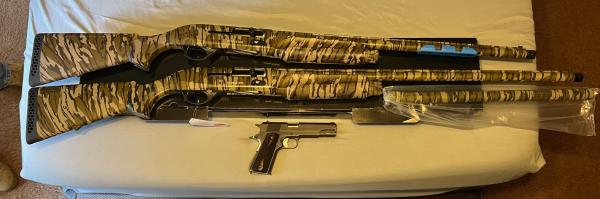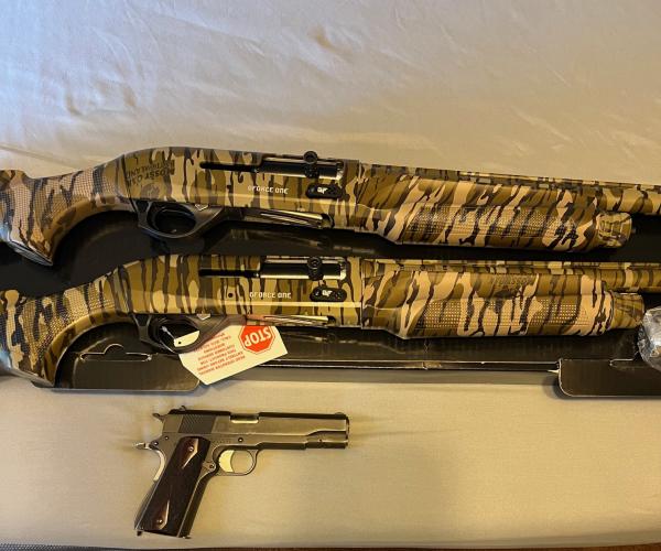 | Two 12-gauge GFORCE Arms. New in the box. One is a 28-inch with an extension tube for 10 round capacity. The other one is a 24-inch with a scope rail so that you can put a scope on it or take the rail off. They both come with 5 extended choke tubes. The camo is Mossy Oak Bottomland. $450.00 each. Model 1911-A1 made by Springfield Armory. 45 auto caliber. $600.00. Call (270)354-8505. |