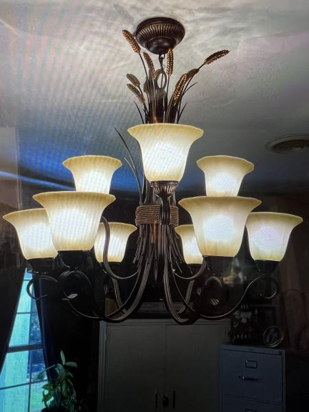 I have a beautiful chandelier for sale. We replaced the chandelier with a ceiling fan and that is the reason we are selling it. The wiring is good and all the lights work. See the photos. It is very big and quite heavy. If you are interested, please call 615-300-7737 and have a blessed day. We are 15 minutes from MURRAY, Kentucky. |