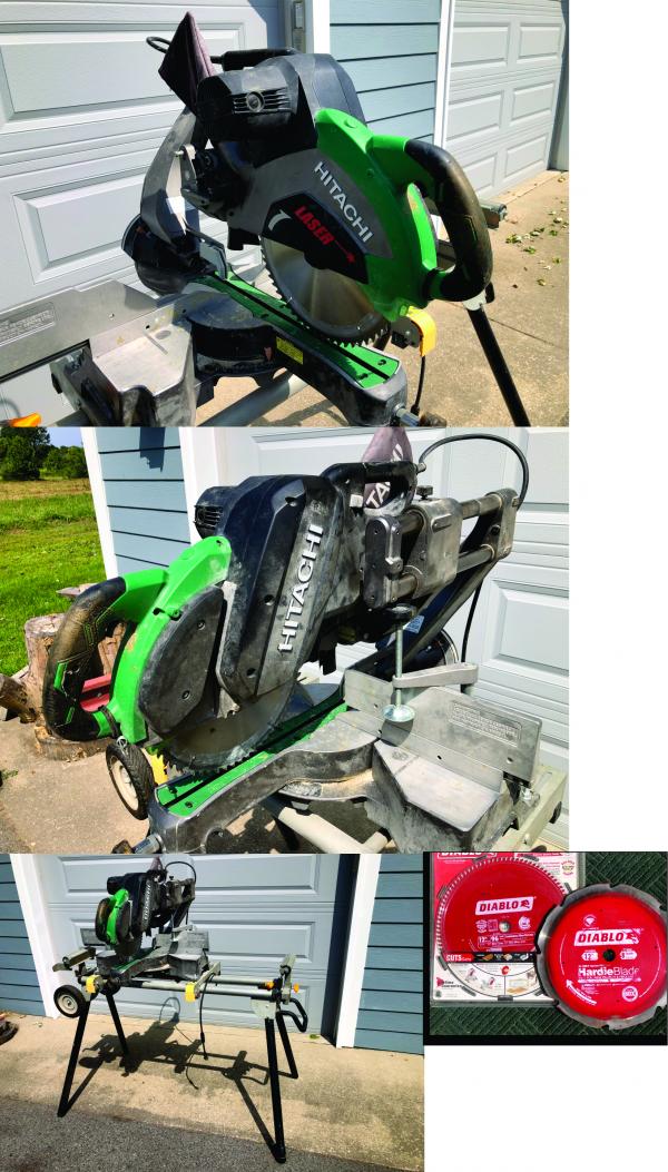 | Price Drop! Hitachi 12" Double Bevel Sliding Compound Miter Saw with wheeled base. This saw is a workhorse. There is one new and one used extra blade, (as pictured) along with the one installed. |