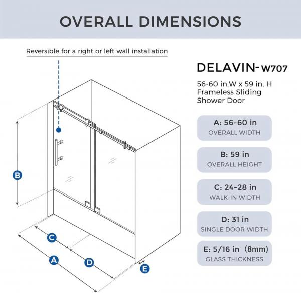 | DELAVIN 56-60" W x 59" H Frameless Sliding Tub/Shower Door Brand new in box $400 OBO Can deliver for a fee or you are welcome to pick up. Feel free to message me with any questions. |