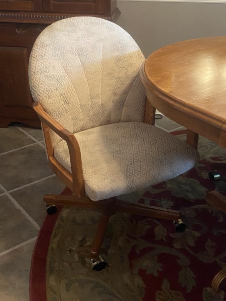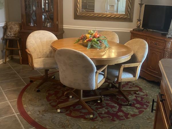 | 42''X54'' Oak Pedestal Kitchen Table with 12'' Embedded Leaf and 4 Oak Swivel and tilt Caster Chairs with Cream upholstery. Table has a few minor heat spots, otherwise all in good condition. $300 cash Lorie 270-559-8008 |