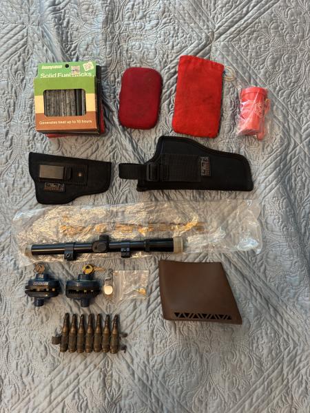 | Tasco scope and mounts for pellet rifles and .22 rifles 2 Master lock brand trigger locks Old Winchester key ring/light from the 80's (battery is dead) Winchester pin from 1990 SHOT Show Slip-on recoil pad (also adds 1/2” to stock) Uncle Mike’s holster size 1 Uncle Mike’s holster size 5 2 handwarmers with 3 boxes of fuel New in package emergency whistle No holds or delivery. Cash only. Everything listed for $20 Ammo at the bottom of the pic is not included. |