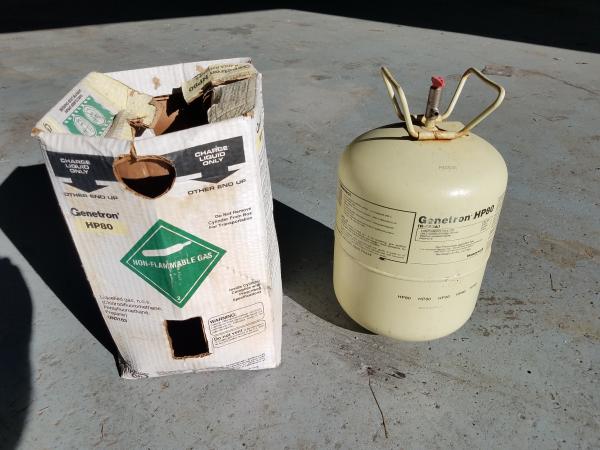 | Appears to be a full canister of Genetron HP80 r402a refrigerant used in commercial freezers, walk in coolers, half price of new. Text two70-933-336one |