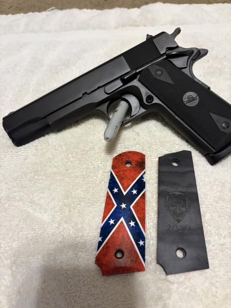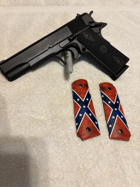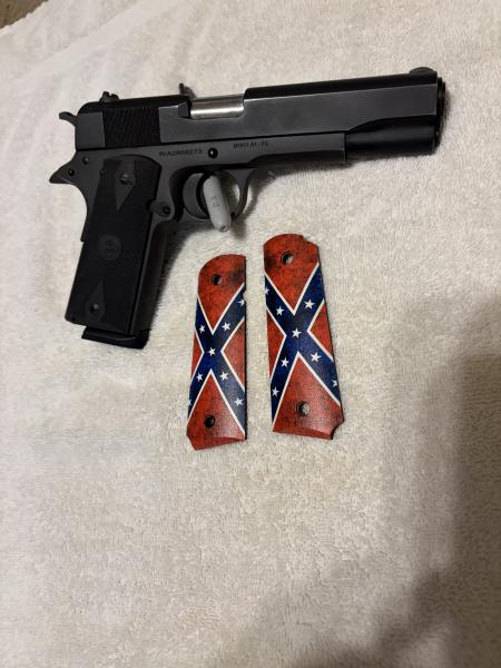 | Rock Island Armory 1911A1,.45 ACP,very good condition,very good shooting gun,original grips + Wicked Grips "Stars & Bars" made in 2022($90). No box,$400 FIRM CASH ONLY! MUST be a legal KY resident 21 or older. Text(270)227-0453. Will meet in Draffenville. *Also have a leather holster with it(NOT shown in pict.)* |