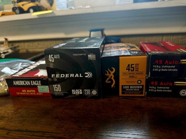 | I've sold my .45 1911s and have some .45 auto ammo leftover after the sales. $21 a box of 50. If you buy all 400 rounds for $165.00, I'll throw in a bag of mixed ball ammo and hollow point (+- 20rounds). |