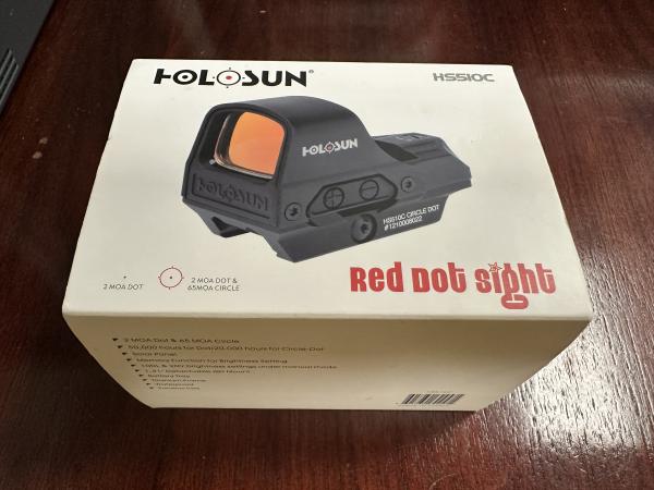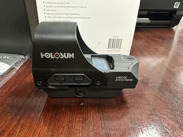 | Basically New Holosun HS510C Red Dot Sight with box. *2MOA & 65 MOA Circle *50,000 hours for dot/ 20,000 hours for circle dot *Solar Panel *Waterproof *Detachable Mount Call or text 2seven0-2nine3-8two8five $275 |