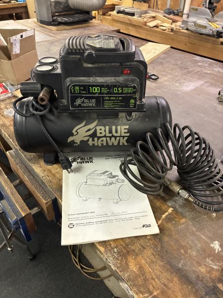 | Blue Hawk air compressor, 18ga Porter Cable nail gun, 10 ft air hose with fittings. Excellent condition. $130.00. 270-703-8610. |